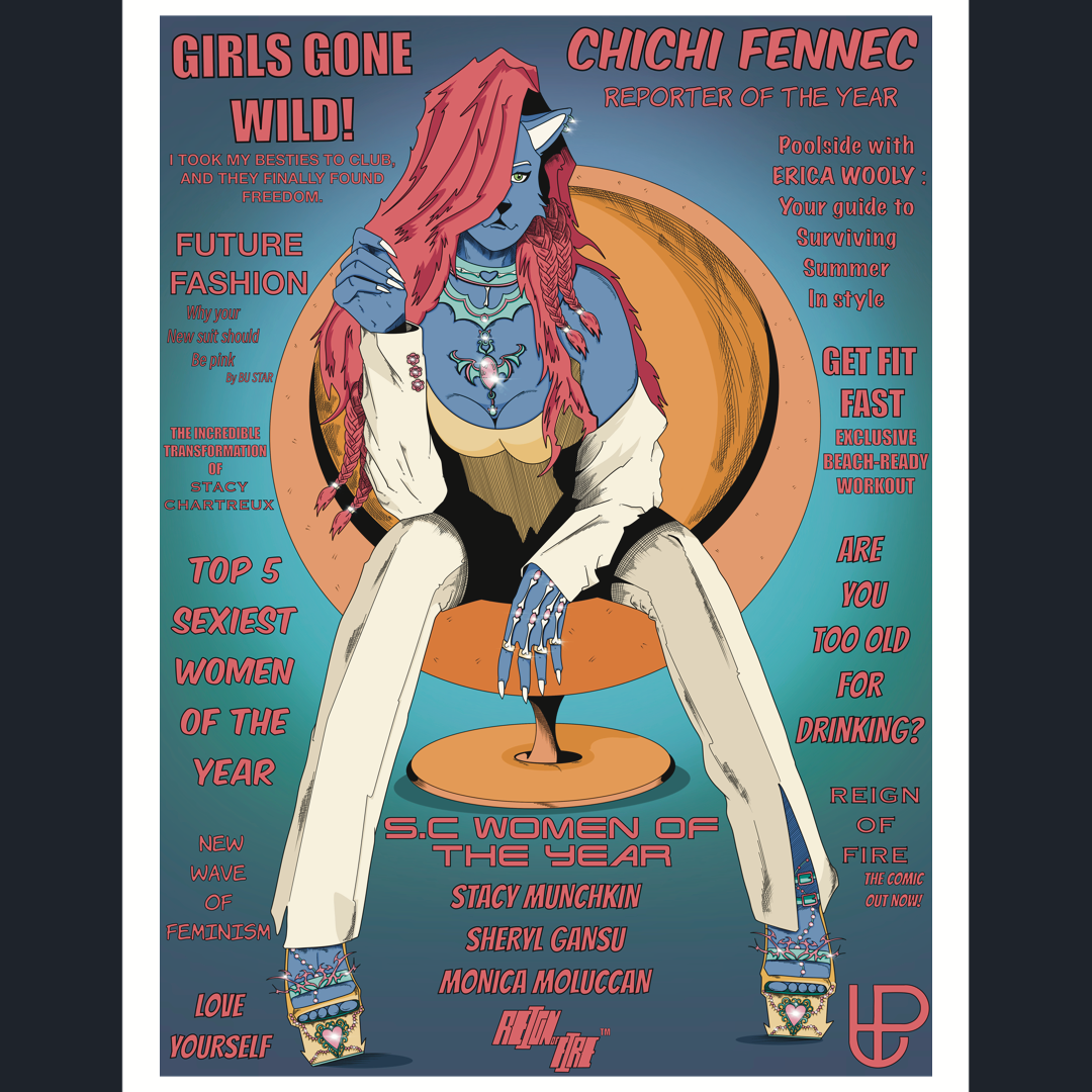 CHI CHI Reporter Of The Year Poster from the world of REIGN OF FIRE comic. SIZE : 18x24 INCHES Extra : 2x2 inches of white borders for framing or taping up the artwork.