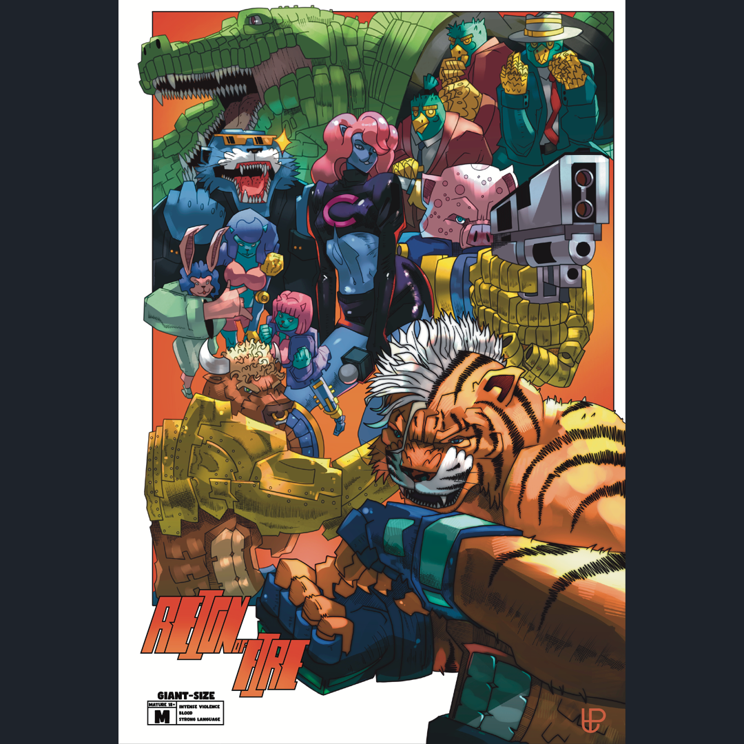 REIGN OF FIRE is a 72 page cyberpunk theme comic about 2 war vets ,Rayzor "the skullcrusher" Panthera VS Rocky "the deathmachine" Holstein. Who would emerge victorious in mano e mano death match ? Fully Colored.